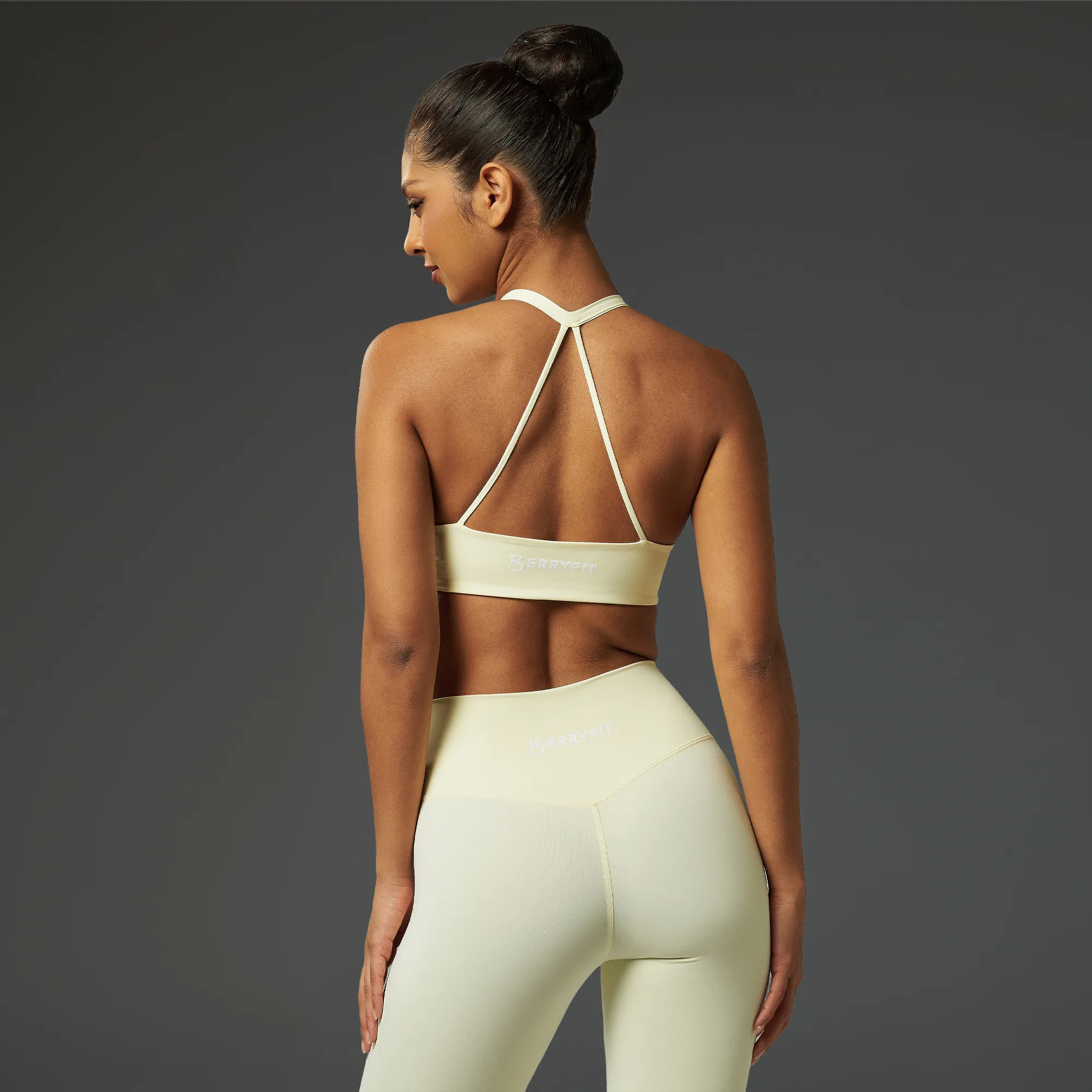 The Curva Bra features a clean front with an elegant open-back design, where slim criss-cross straps frame the shoulders and upper back. A supportive underband keeps the fit secure while allowing full freedom of movement and a naturally lifted shape.